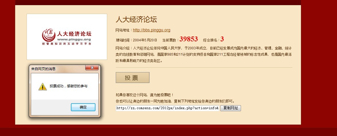 人大经济论坛亲爱的坛友们:本论坛正在参加“2012互联网社区龙虎榜”投票评选活动,今天距离投票结束仅剩11天了,截止到今日0:00我们的票数是39773,第3名。我们非常期待您宝贵的一票!让我们一起为我们心爱的论坛投上今天最关键的一票吧!投票地址:http://zz.comsenz.com/2012px/index.php?action=info&id=1312