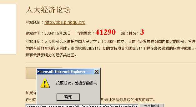 在学校一天一票,现在大概41358 了。论坛会员挺多的呀,希望大家加油投票吧,不容易的,感谢论坛这几年来给我提供的这么多资料和信息。
