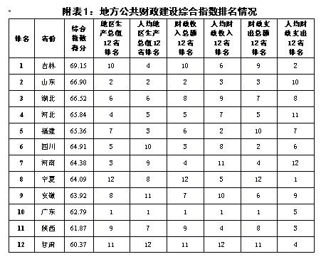 在运行绩效分项指数中,财政均等化因素指数排名,位列前3的分别是河北省、吉林省和福建省;位列第10、11和12的,分别是安徽省、广东省和甘肃省。可持续性因素指数排名,位列前3的分别是陕西省、山东省和吉林省;位列第10、11和12的,分别是广东省、河南省和四川省。绩效改善度因素指数排名,位列前3的分别是河北省、宁夏回族自治区和四川省;位列第10、11和12的,分别是福建省、甘肃省和广东省。(参见附表3)