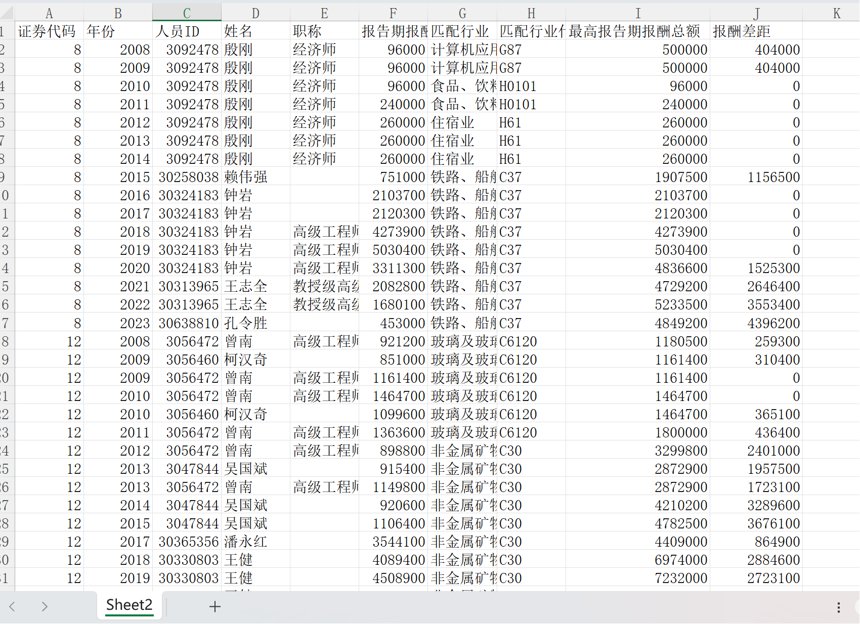 证券代码 年份 人员ID 姓名 职称 报告期报酬总额 匹配行业 匹配行业代码 最高报告期报酬总额 报酬差距