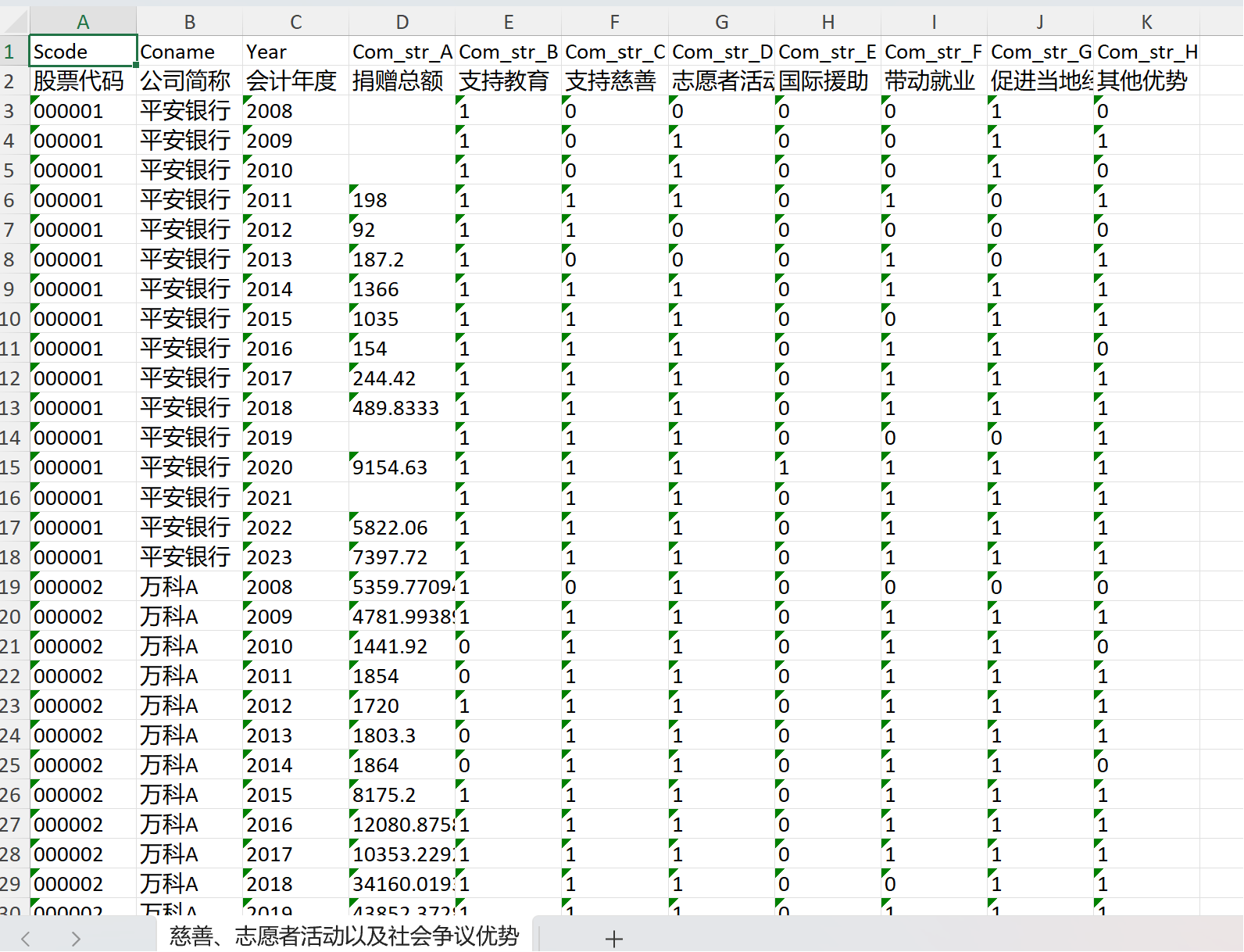 数据名称:上市公司社会活动数据08-23年慈善捐款总额支持教育志愿者服务国外援助带动就业等1.4万+数据
