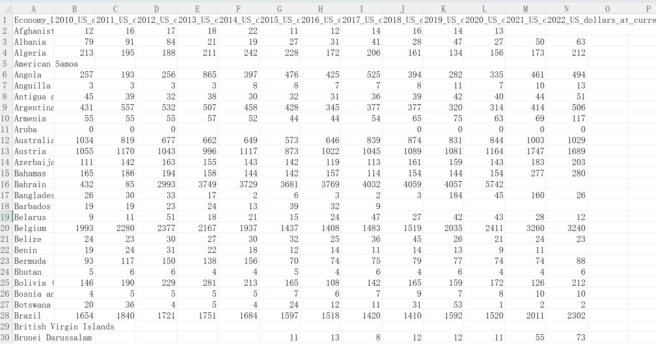 数据名称:世界各国保险和养老金服务进出口额10-22年数据服务贸易数据