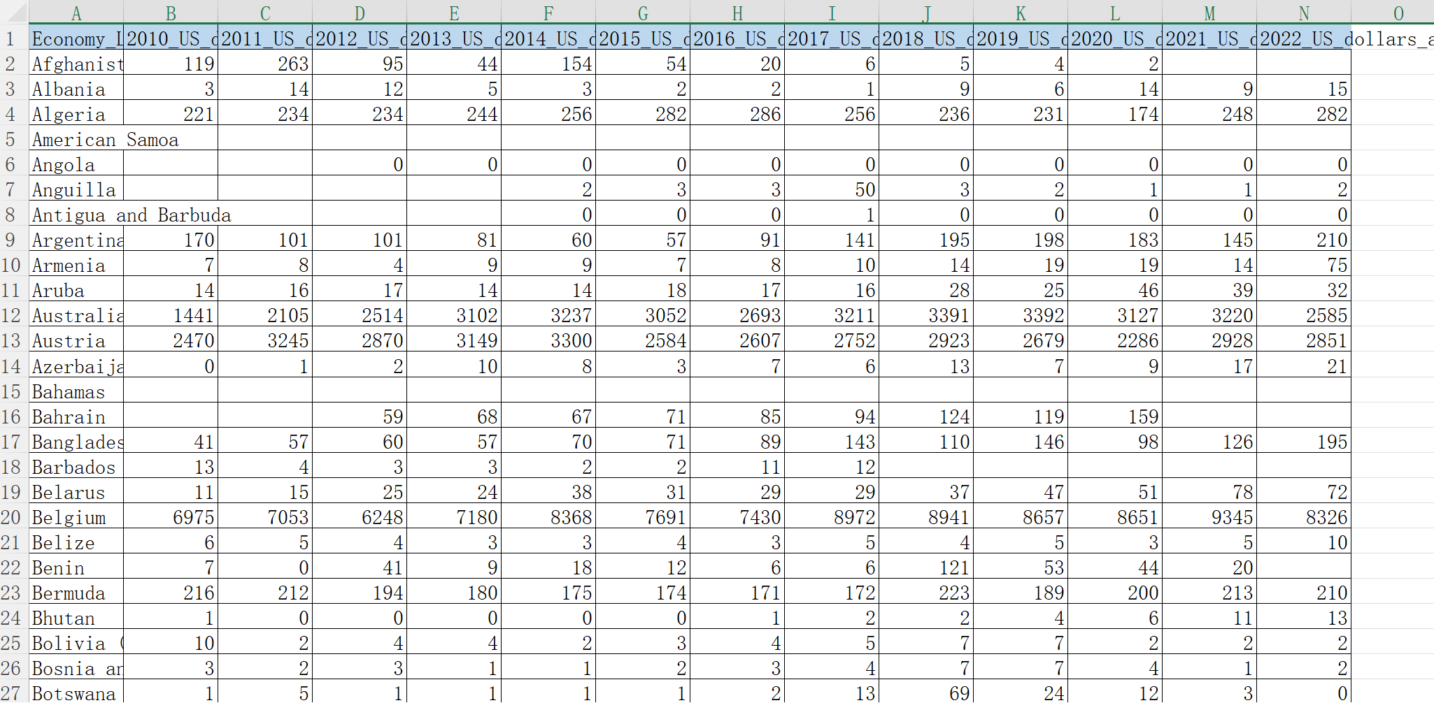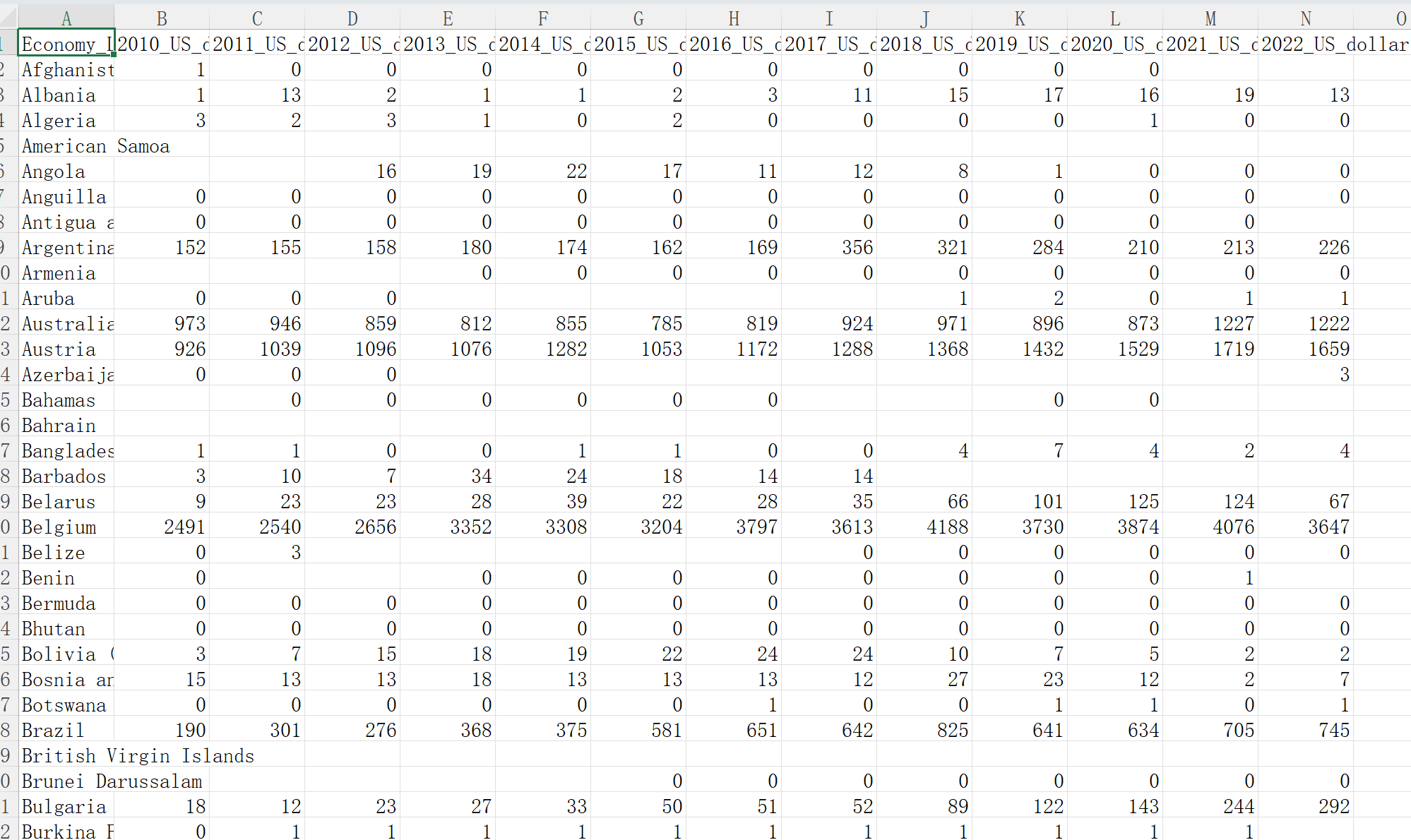 数据名称:世界各国金融服务进出口额10-22年数据金融发展水平服务贸易数据