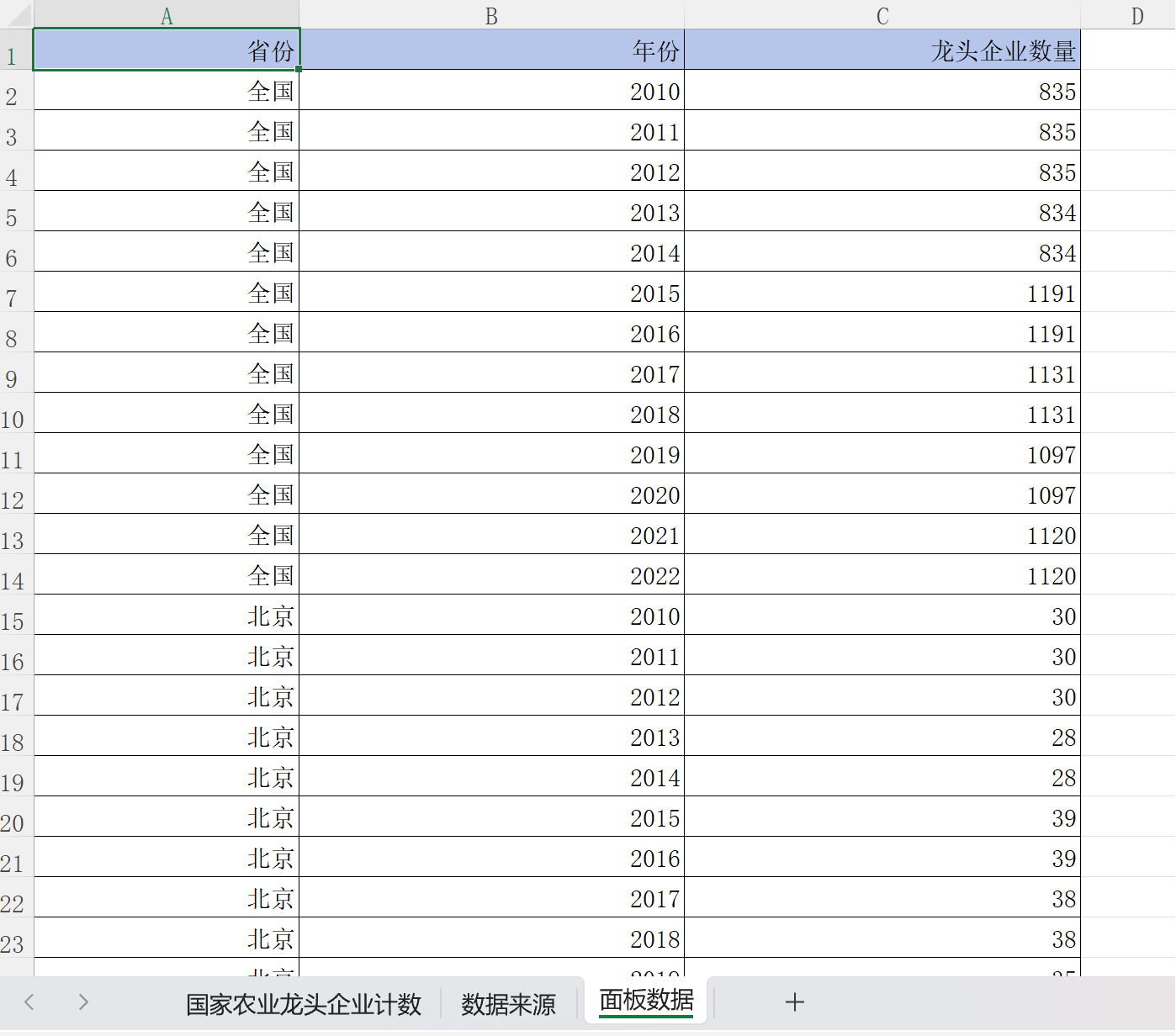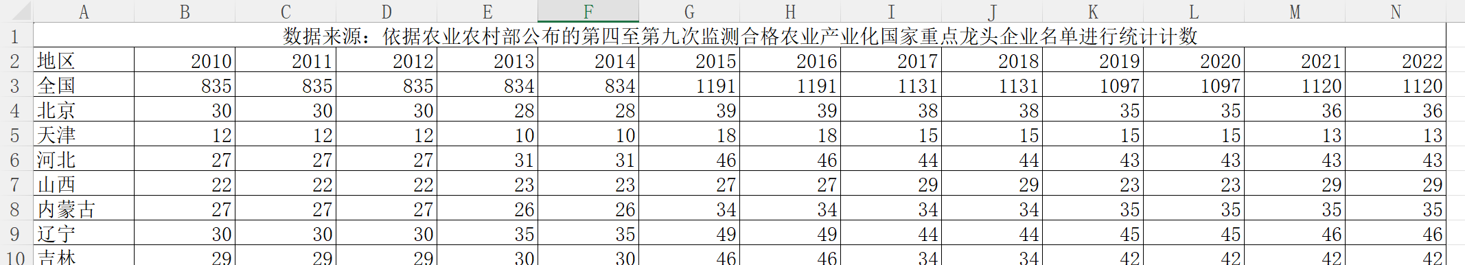 数据名称:各省份农业发展水平农业支持力度指标农业龙头企业数量10-22年数据