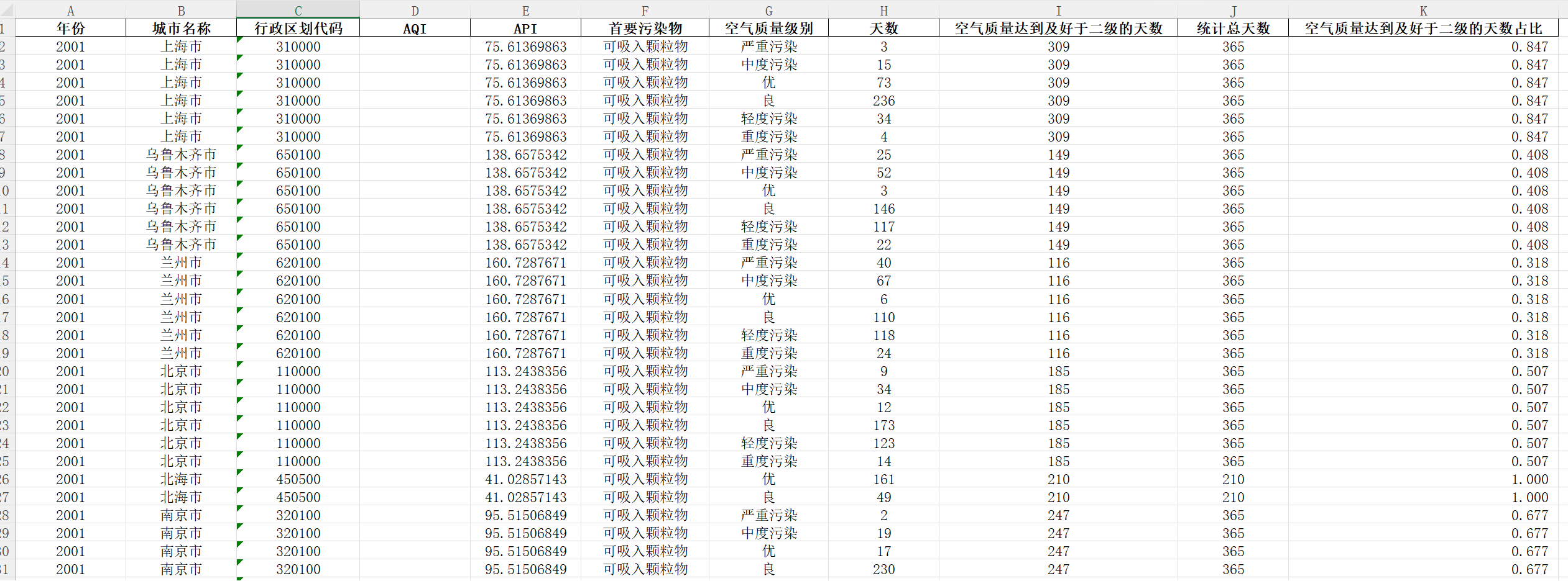 日期 年份 行政区划代码 城市名称 AQI API 空气质量级别 首要污染物 天数 空气质量达到及好于二级的天数