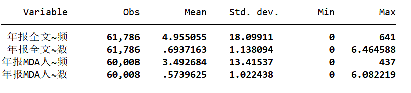 处理软件:原始数据为使用Python对上市公司年报进行文本分析后获得(jieba分词,停用词表使用哈工大停用词表),后续使用Stata进行整理,最终形成面板数据形式