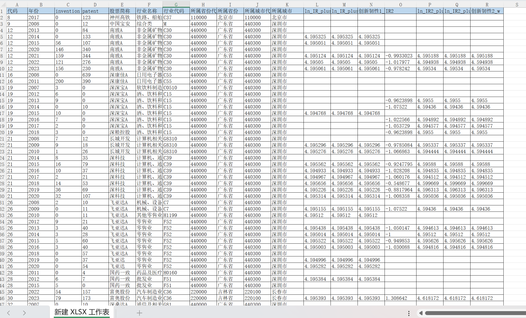 代码 年份 invention patent 股票简称 行业名称 行业代码 所属省份代码 所属省份 所属城市代码 所属城市 ln_IR_plus_100 ln_IR_plus_100_w 创新韧性1_w IR2 ln_IR2_plus_100 ln_IR2_plus_100_w 创新韧性2_w