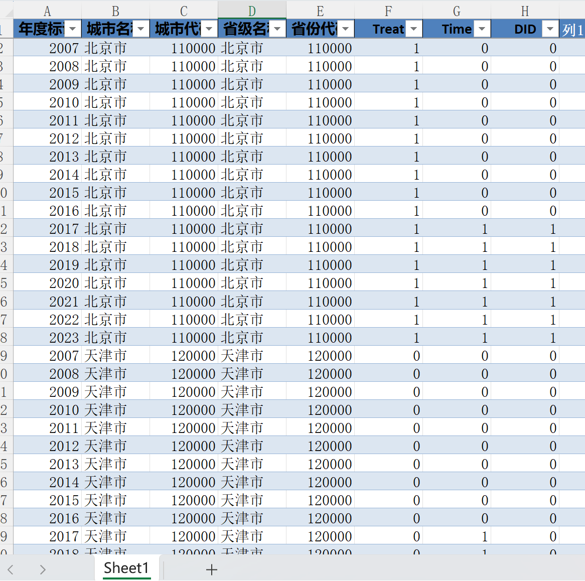 年度标识 城市名称 城市代码 省级名称 省份代码 Treat Time DID