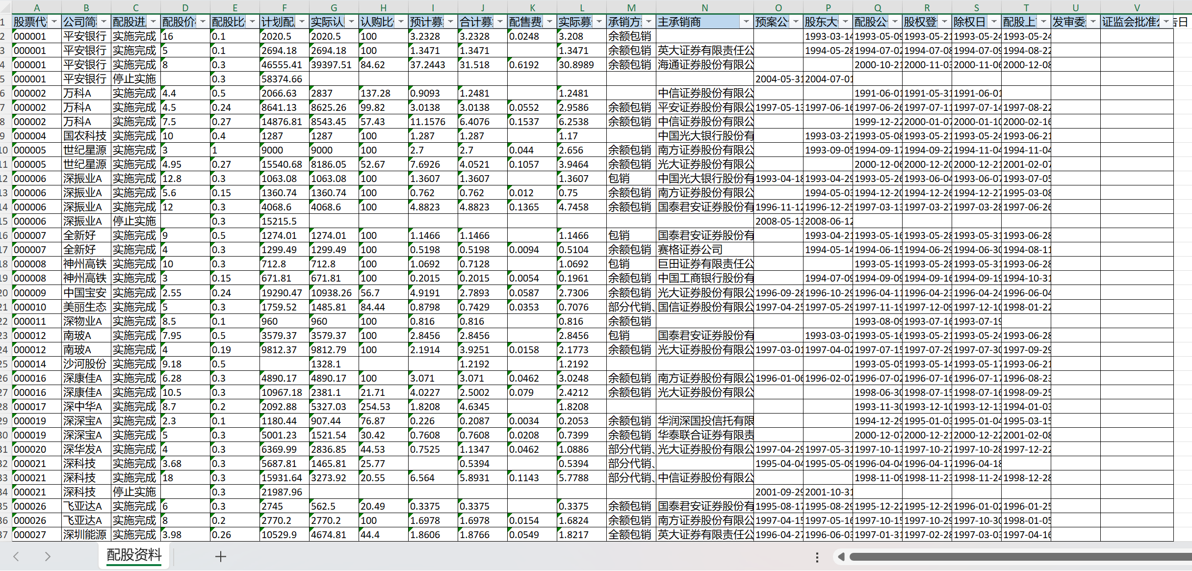 配股(1991-2023年)指标:股票代码、公司简称、配股进度、配股价格、配股比例、计划配股数量、实际认购数量、认购比例(%) 、预计募集资金、合计募集资金、配售费用、实际募资资金、承销方式、主承销商、预案公告日、股东大会公告日、配股公告日、股权登记日、除权日、配股上市日、发审委通过公告日、证监会批准公告日。