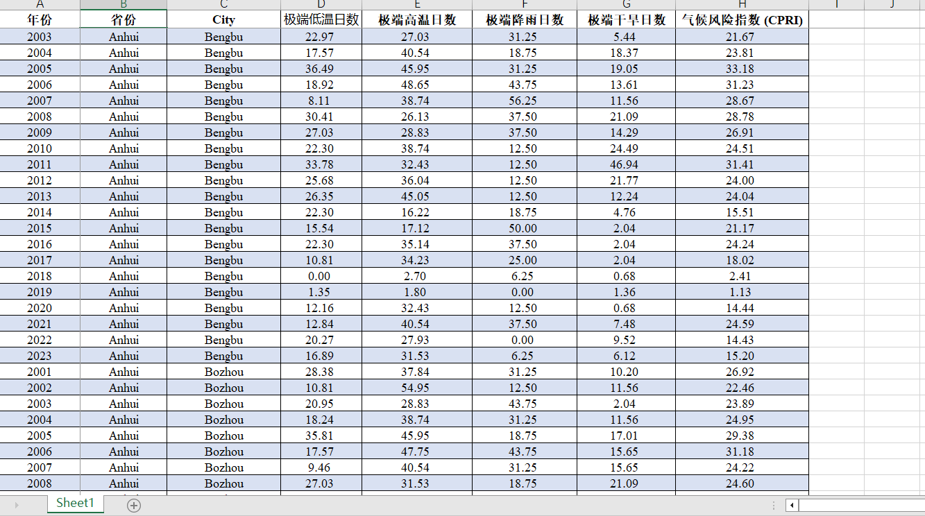 2.中国各省气候风险数据主要包括极端低温、极端高温、极端降雨及极端干旱日数的相关数据。其中,极端低(高)温日数指的是一年内气温低(高)于某一极限值的天数、极端降雨日数指一年内降雨量超过某一极限值的天数、极端干旱日数指一年内降水量低于某一阈值的天数。