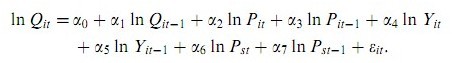 我打的是log(qit)=c(1)+c(2)log(qit_1)+c(3)log(pit)+c(4)log(pit_1)+c(5)log(yit)+c(6)log(yit_1)+c(7)log(pst)+c(8)log(pst_1)+c(9)dummy