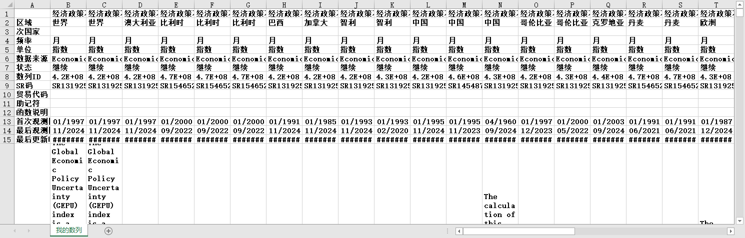 经济政策不确定性指数:全球:现价GDP 经济政策不确定性指数:全球:购买力平价调整后的GDP 经济政策不确定性指数:澳大利亚 经济政策不确定性指数:比利时 经济政策不确定性指数:比利时:荷兰语 经济政策不确定性指数:比利时:法语 经济政策不确定性指数:巴西 经济政策不确定性指数:加拿大 经济政策不确定性指数:智利 经济政策不确定性指数:智利:本土 经济政策不确定性指数:中国 经济政策不确定性指数:中国:SCMP 经济政策不确定性指数:中国:中国内地报纸 经济政策不确定性指数:哥伦比亚 经济政策不确定性指数:哥伦比亚:本土 经济政策不确定性指数:克罗地亚 经济政策不确定性指数:丹麦 经济政策不确定性指数:丹麦:Extended Keywords 经济政策不确定性指数:欧洲 经济政策不确定性指数:法国 经济政策不确定性指数:德国 经济政策不确定性指数:希腊 经济政策不确定性指数:中国香港特别行政区 经济政策不确定性指数:印度 经济政策不确定性指数:爱尔兰 经济政策不确定性指数:意大利 经济政策不确定性指数:日本 经济政策不确定性指数:墨西哥 经济政策不确定性指数:荷兰 经济政策不确定性指数:荷兰:本土 经济政策不确定性指数:巴基斯坦:2家报纸(《商业记录报》、《论坛快报》) 经济政策不确定性指数:巴基斯坦:4家报纸(《商业记录报》、《论坛快报》、《黎明报》和《新闻报》) 经济政策不确定性指数:俄罗斯 经济政策不确定性指数:新加坡 经济政策不确定性指数:韩国 经济政策不确定性指数:西班牙 经济政策不确定性指数:西班牙:7份报纸 经济政策不确定性指数:瑞典 经济政策不确定性指数:英国 经济政策不确定性指数:英国:11份报纸 经济政策不确定性指数:美国 经济政策不确定性指数:美国:三大成分指数 经济政策不确定性指数:哥伦比亚:季度 经济政策不确定性指数:哥伦比亚:本土:季度 经济政策不确定性指数:哥伦比亚:年度 经济政策不确定性指数:哥伦比亚:本土:年度