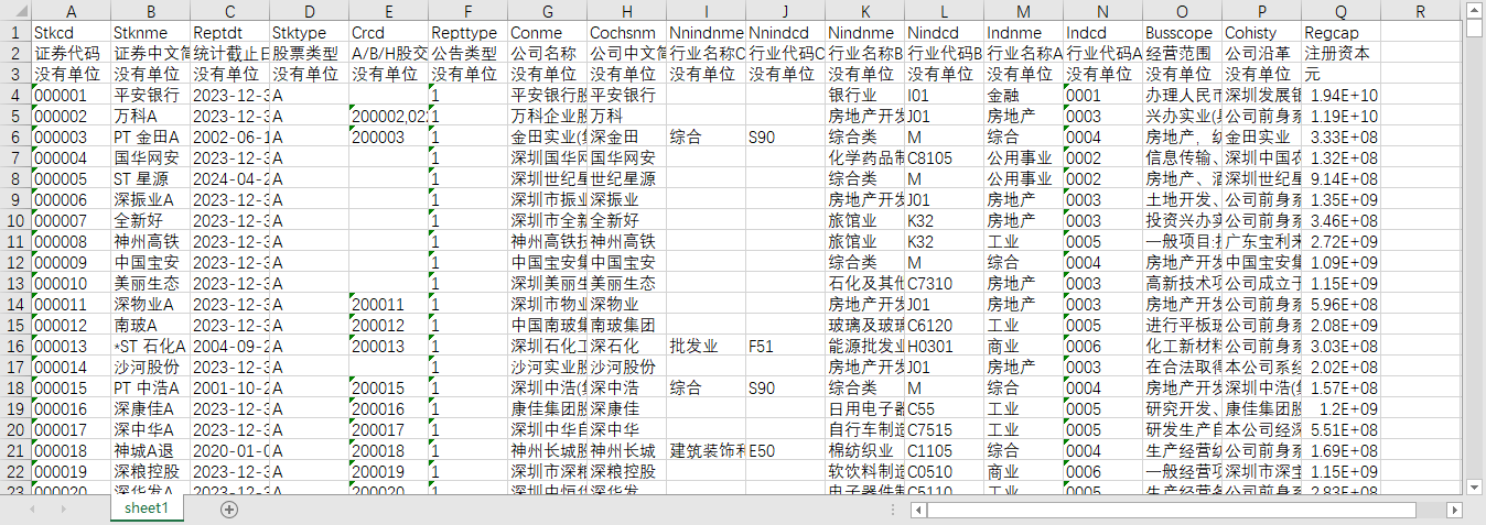 证券代码 证券中文简称 统计截止日期 股票类型 A/B/H股交叉码 公告类型 公司名称 公司中文简称 行业名称C 行业代码C 行业名称B 行业代码B 行业名称A 行业代码A 经营范围 公司沿革 注册资本