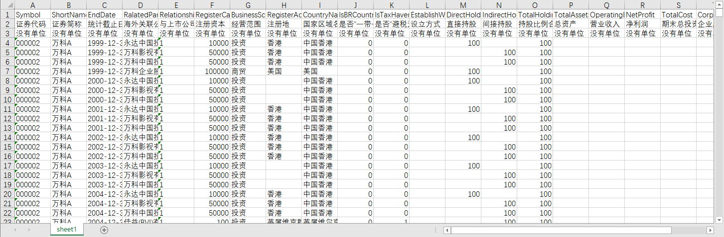 证券代码 证券简称 统计截止日期 海外关联公司名称 与上市公司关系编码 注册资本 经营范围 注册地 国家区域名称 是否“一带一路”国家 是否“避税天堂” 设立方式 直接持股 间接持股 持股比例合计 总资产 营业收入 净利润 期末总投资额 企业所得税率 是否退出 币种