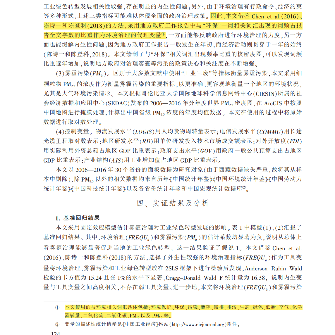 借鉴Chen et al.(2016)、陈诗一和陈登科(2018)的方法,采用地方政府工作报告中与“环保”一词相关词汇出现的词频与报告全文字数的之比作为环境治理的代理变量。