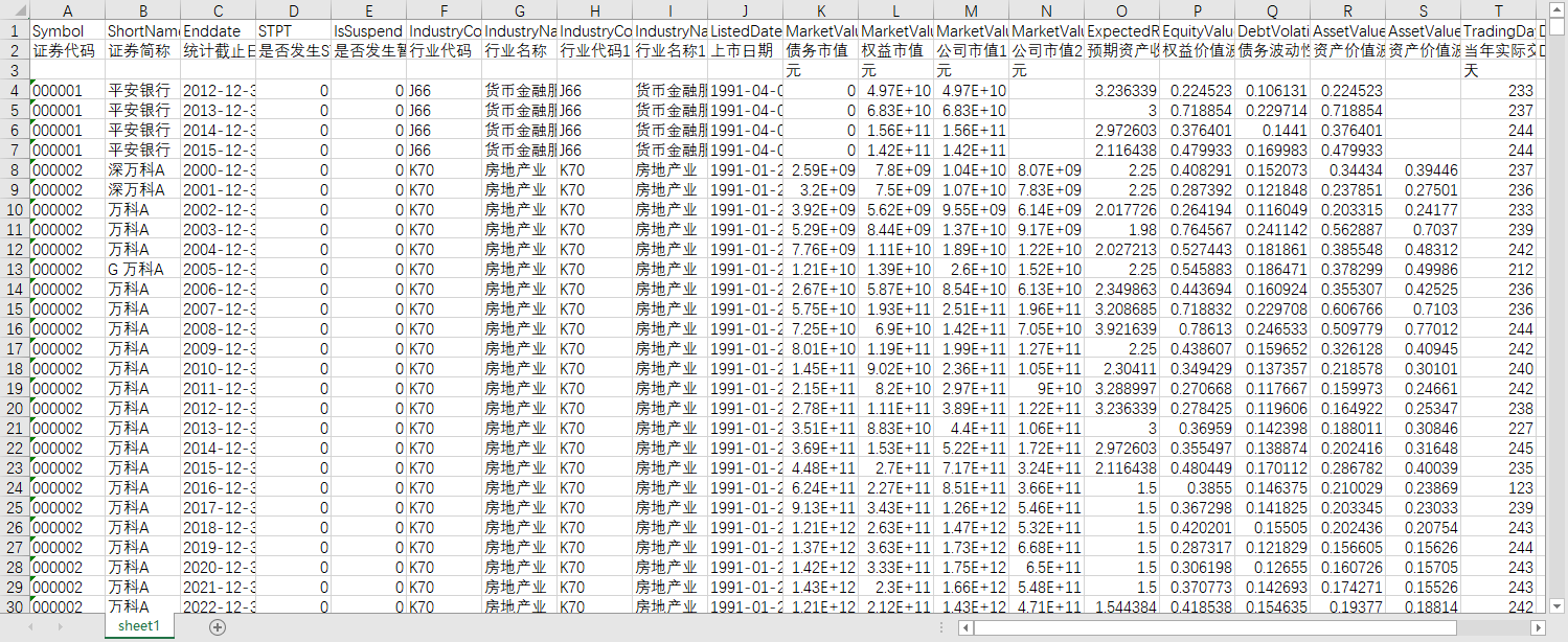 证券代码 证券简称 统计截止日期 是否发生ST或*ST或PT 是否发生暂停上市 行业代码 行业名称 行业代码1 行业名称1 上市日期 债务市值 权益市值 公司市值1 公司市值2 预期资产收益率 权益价值波动性 债务波动性 资产价值波动性1 资产价值波动性2 当年实际交易天数 DD_Bhsh DD_merton DD_KMV