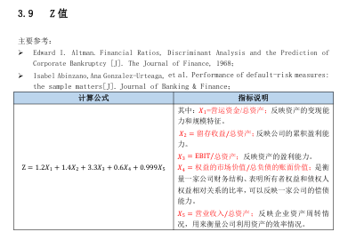 ZScore [Z值] - 反映公司的财务困境,具体算法见说明书“Z值”。Z评分法,以2.67和1.81作为临界值计算样本得分所处的范围,判断标准是Z>2.67为财务状况良好,发生破产的可能性较小,Z<1.81为财务困境,潜伏着破产危机,1.81<Z<2.67为灰色地带,说明企业的财务状况极不稳定,发生财务困境的可能性很大。