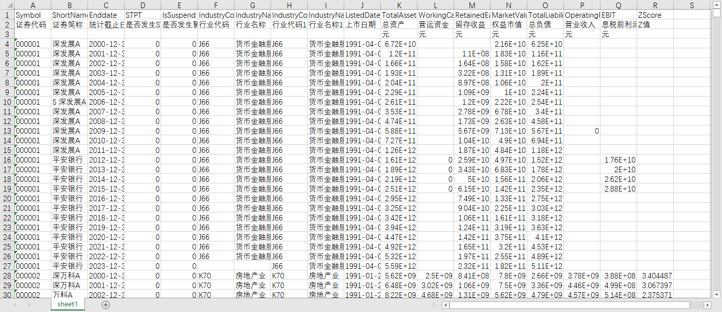 证券代码 证券简称 统计截止日期 是否发生ST或*ST或PT 是否发生暂停上市 行业代码 行业名称 行业代码1 行业名称1 上市日期 总资产 营运资金 留存收益 权益市值 总负债 营业收入 息税前利润 Z值