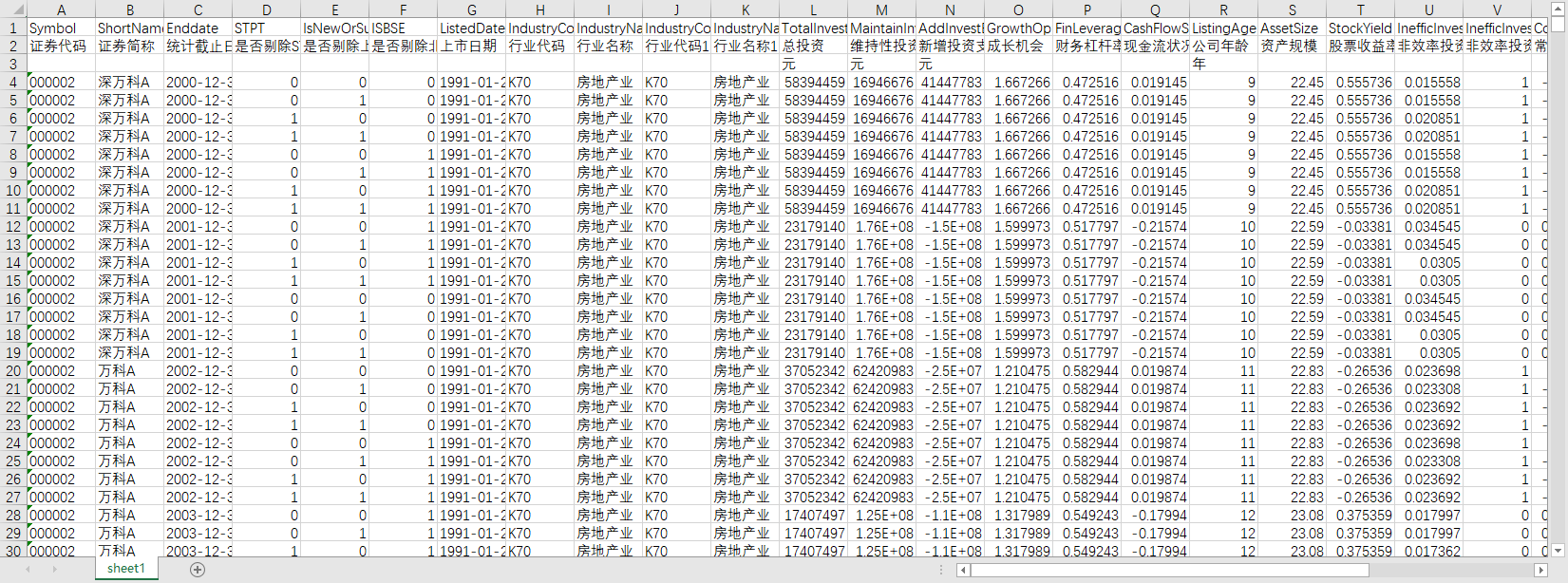证券代码 证券简称 统计截止日期 是否剔除ST或*ST或PT股 是否剔除上市不满一年、已经退市或被暂停上市的公司 是否剔除北交所上市公司 上市日期 行业代码 行业名称 行业代码1 行业名称1 总投资 维持性投资 新增投资支出 成长机会 财务杠杆率 现金流状况 公司年龄 资产规模 股票收益率 非效率投资程度 非效率投资标识 常数项α0 系数α1 系数α2 系数α3 系数α4 系数α5 系数α6 系数α7 残差ε