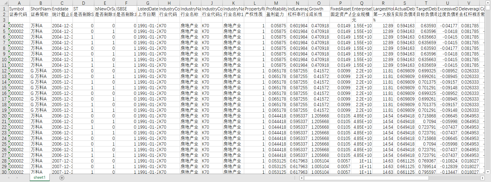 证券代码 证券简称 统计截止日期 是否剔除ST或*ST股 是否剔除当年新上市、已经退市或被暂停退市的公司 是否剔除北交所上市公司 上市日期 行业代码 行业名称 行业代码1 行业名称1 产权性质 盈利能力 杠杆率行业中位数 成长性 固定资产占比 企业规模 第一大股东持股比例 实际负债率 目标负债率 过度负债程度 去杠杆程度 常数项α0 系数α1 系数α2 系数α3 系数α4 系数α5 系数α6 系数α7 残差ε