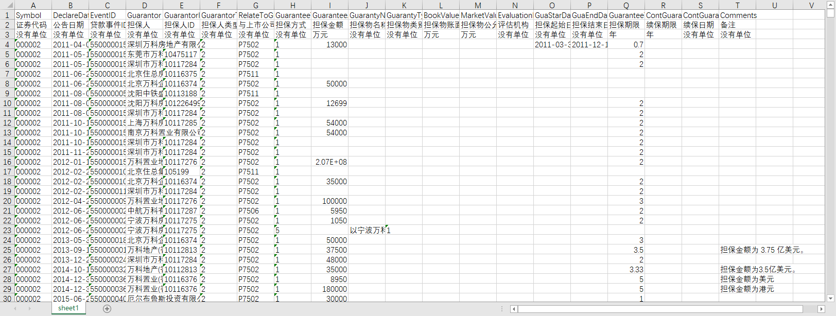 证券代码 公告日期 贷款事件ID 担保人 担保人ID 担保人类型 与上市公司关系编码 担保方式 担保金额 担保物名称 担保物类别 担保物账面价值 担保物公允价值 评估机构 担保起始日期 担保结束日期 担保期限 续保期限 续保日期 备注