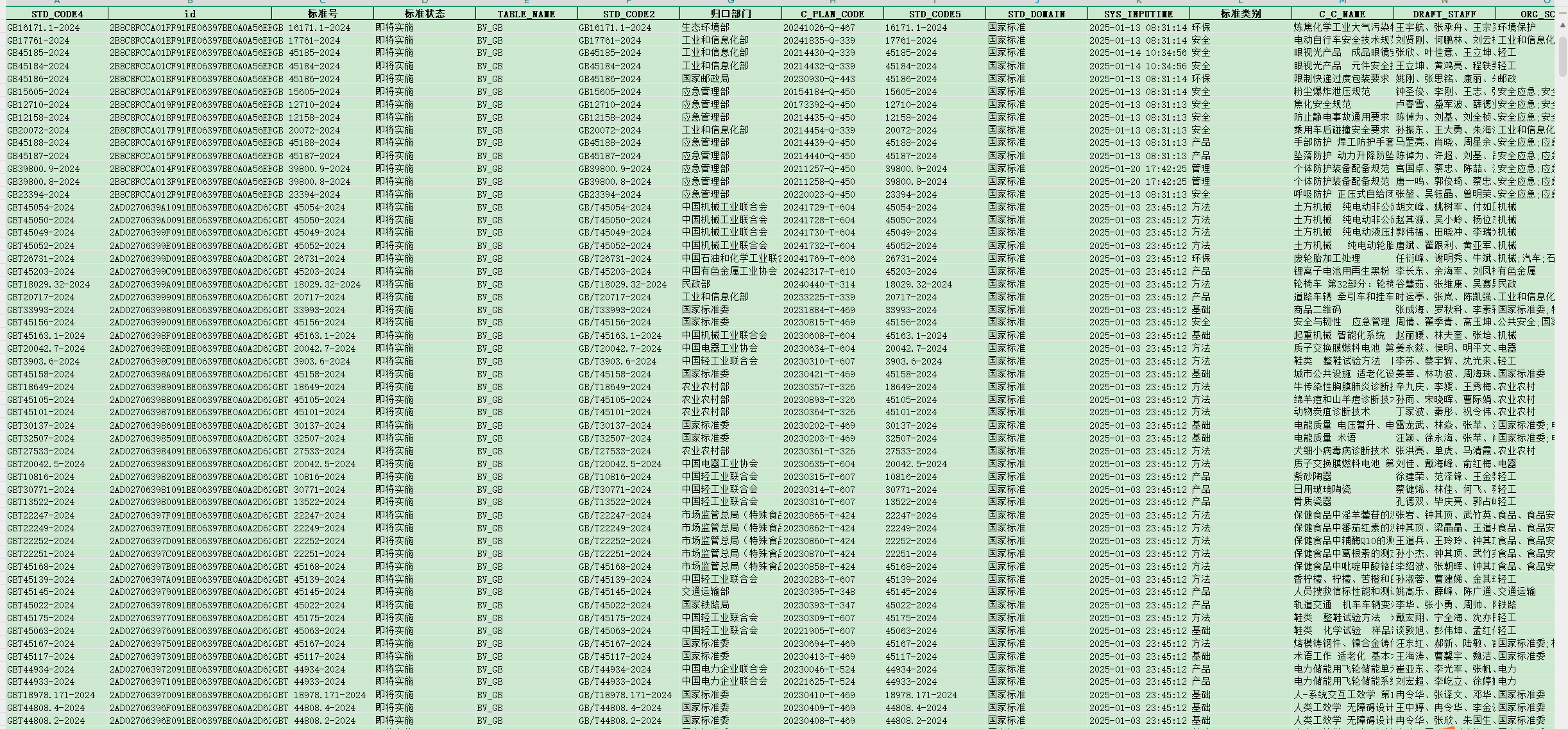 https://std.samr.gov.cn/gb/search/gbAdvancedSearch?type=std#)获取了每项国家标准(71177条)、地方标准(106881条)、行业标准(107750条)的详细信息,包括标准号、标准名称、起草单位、发布时间、替换时间或废止时间等有效时间信息,中国标准分类号、国际标准分类号、标准类别等基本特征信息,以及是否采用国际标准、采用方式等标准国际化相关信息。可以工企数据库、专利交易数据库、上市公司数据库匹配