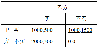 桑朔 发表于 2012-3-19 17:16 甲乙双方均购买,即甲自己单独购买一台,此时他得到的剩余为2000(保留价格)-1000(购买成本)=1000,同 ...