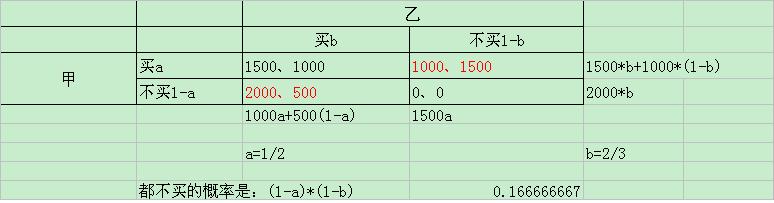 jamesgoon 发表于 2012-4-9 23:29 乙 买b 不买1-b 甲 买a 1500、1000 1000、1500 1500*b+1000*(1-b)