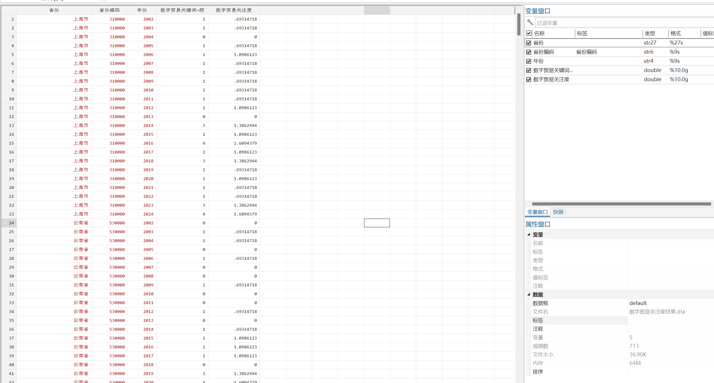 做法概述:使用各省份ZF工作报告中涉及数字贸易的关键词词频统计数量加“1”后的自然对数,衡量地方ZF对数字贸易关注度