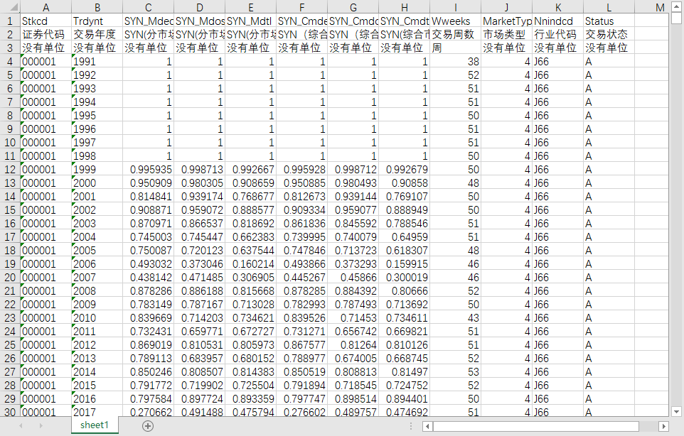 证券代码 交易年度 SYN(分市场等权平均法) SYN(分市场流通市值平均法) SYN(分市场总市值平均法) SYN(综合市场等权平均法) SYN(综合市场流通市值平均法) SYN(综合市场总市值平均法) 交易周数 市场类型 行业代码 交易状态