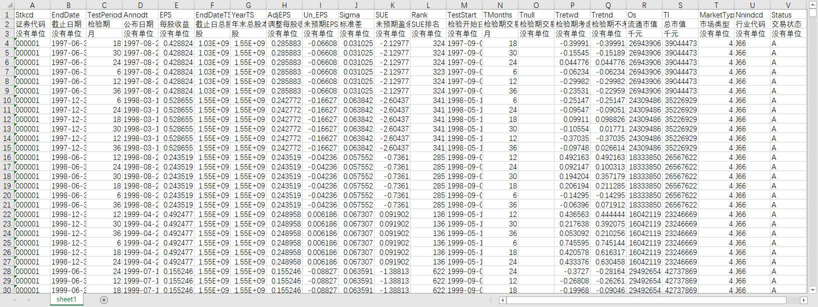证券代码 截止日期 检验期 公布日期 每股收益 截止日总股本 年末总股本 调整每股收益EPS* 未预期EPS 标准差 未预期盈余SUE SUE排名 检验开始日期 检验期交易月数 检验期交易标识 检验期考虑现金红利再投资回报率 检验期不考虑现金红利再投资回报率 流通市值 总市值 市场类型 行业代码 交易状态
