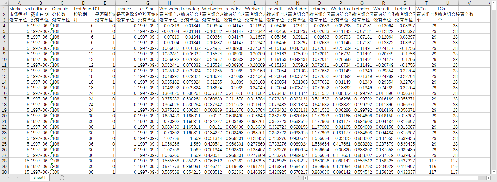 市场类型 截止日期 分位数 检验期 是否剔除ST股 是否剔除金融股 检验开始日期 赢者组合考虑现金红利再投资回报率(等权平均法) 输者组合考虑现金红利再投资回报率(等权平均法) 赢者组合考虑现金红利再投资回报率(流通市值平均法) 输者组合考虑现金红利再投资回报率(流通市值平均法) 赢者组合考虑现金红利再投资回报率(总市值平均法) 输者组合考虑现金红利再投资回报率(总市值平均法) 赢者组合不考虑现金红利再投资回报率(等权平均法) 输者组合不考虑现金红利再投资回报率(等权平均法) 赢者组合不考虑现金红利再投资回报率(流通市值平均法) 输者组合不考虑现金红利再投资回报率(流通市值平均法) 赢者组合不考虑现金红利再投资回报率(总市值平均法) 输者组合不考虑现金红利再投资回报率(总市值平均法) 赢者组合股票个数 输者组合股票个数