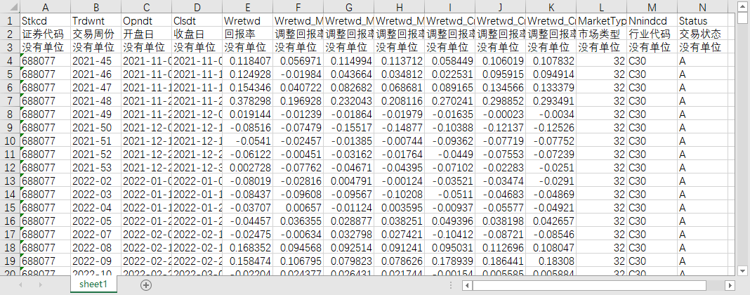 证券代码 交易周份 开盘日 收盘日 回报率 调整回报率(分市场等权平均法) 调整回报率(分市场流通市值平均法) 调整回报率(分市场总市值平均法) 调整回报率(综合市场等权平均法) 调整回报率(综合市场流通市值平均法) 调整回报率(综合市场总市值平均法) 市场类型 行业代码 交易状态