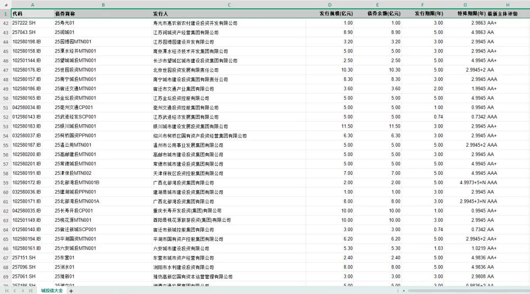 资料范围: 代码、债券简称、发行人、发行规模(亿元) 、债券余额(亿元) 、发行期限(年) 、特殊期限(年) 、最新主体评级、最新债项评级、票面利率(发行参考)、债券类型、上市日期、上市地点、起息日、到期日、摘牌日、发行人省份、发行人城市、发行人区县、发行方式、担保人。