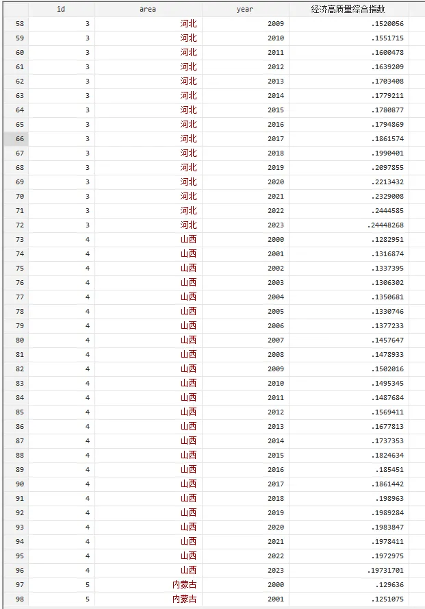 经济高质量发展是适应经济发展新常态的主动选择,是体现新发展理念的发展,即创新、协调、绿色、开放、共享的发展。这种发展方式坚持以人民为中心的发展思想,致力于满足人民日益增长的美好生活需要。经济高质量发展本数据库提供创新发展、协调发展、绿色发展、开放发展和共享发展5个方面的数据供大家参考。