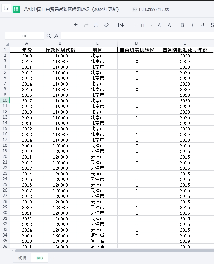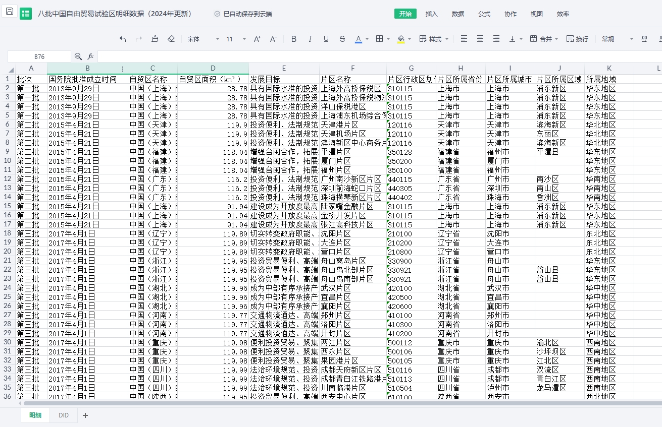 一、测算方式:参考C刊《中国软科学》任晓怡老师(2022)的做法,使用自由贸易试验区(Treat ×Post) 表征,Treat为个体不随时间变化的虚拟变量,如果该城市设立自由贸易试验区则赋值为1,反之赋值为0,Post为自由贸易试验区设立冲击时间变量,按照国家批复自由贸易试验区所属年度,样本城市设立自由贸易试验区当年之前赋值为0,样本城市设立自由贸易试验区后,从设立当期起为1。
