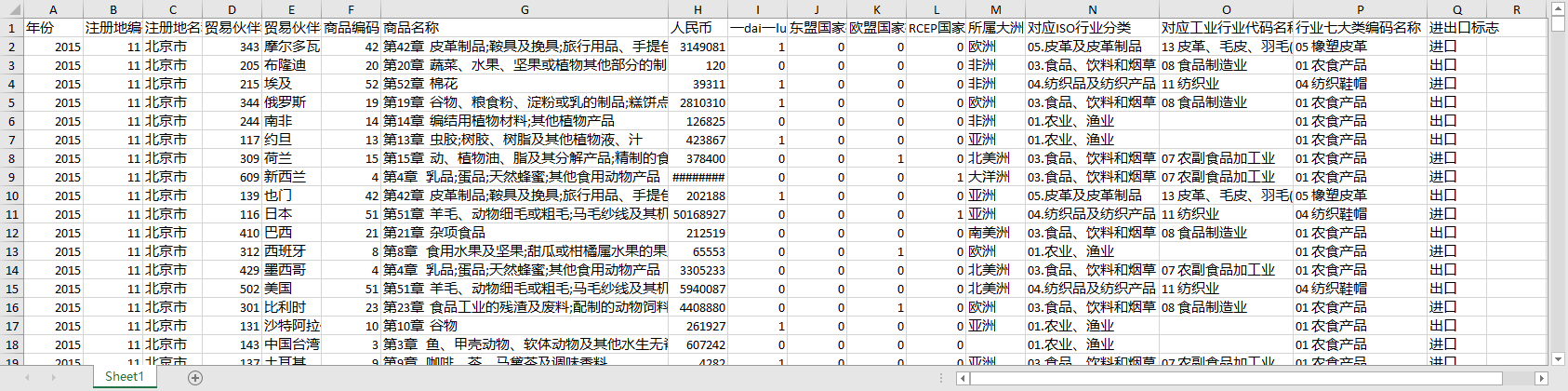 年份 注册地编码 注册地名称 贸易伙伴编码 贸易伙伴名称 商品编码 商品名称 人民币 一dai一lu国家标志 东盟国家标志 欧盟国家标志 RCEP国家标志 所属大洲 对应ISO行业分类 对应工业行业代码名称 行业七大类编码名称 进出口标志