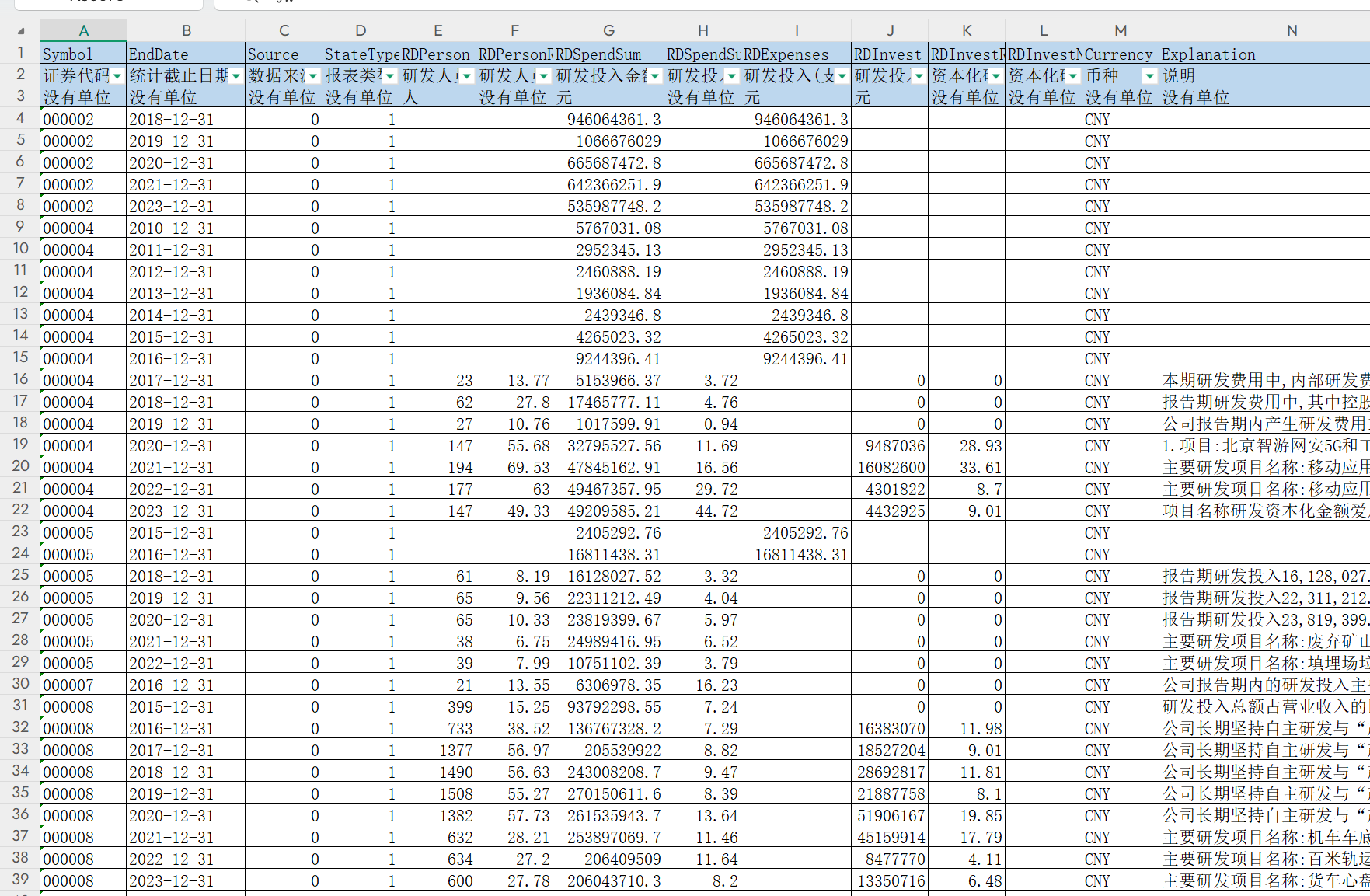 证券代码 统计截止日期 数据来源 报表类型 研发人员数量 研发人员数量占比(%) 研发投入金额 研发投入占营业收入比例(%) 研发投入(支出)费用化的金额 研发投入(支出)资本化的金额 资本化研发投入(支出)占研发投入的比例(%) 资本化研发投入(支出)占当期净利润的比重(%) 币种 说明