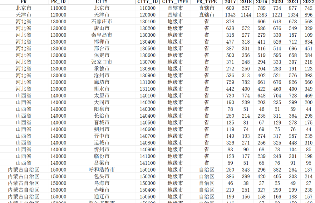 ④由于行政区划调整等因素,部分地级市的部分年份的数据可能有缺失。对于缺失数据的地级市,Excel中用空值表示,Shp中则用0值表示,也就是0值表示的是数据缺失,而不是表示的数据值为0。