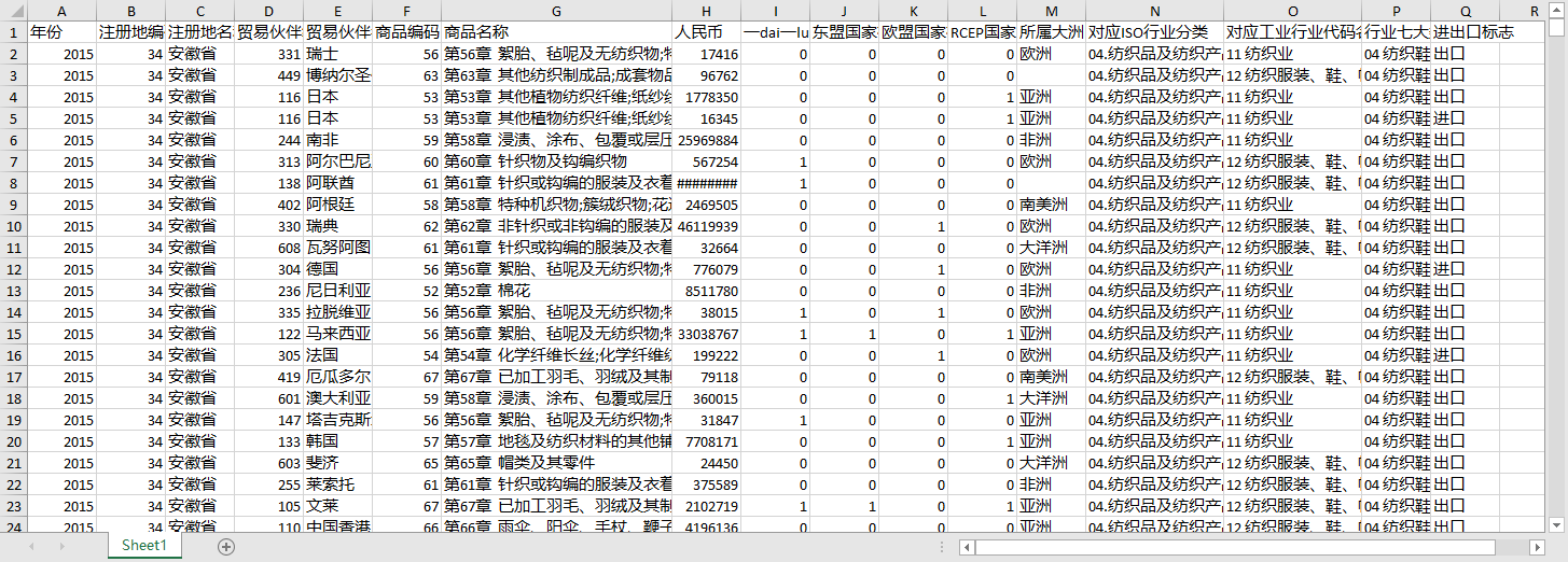年份 注册地编码 注册地名称 贸易伙伴编码 贸易伙伴名称 商品编码 商品名称 人民币 一dai一lu国家标志 东盟国家标志 欧盟国家标志 RCEP国家标志 所属大洲 对应ISO行业分类 对应工业行业代码名称 行业七大类编码名称 进出口标志