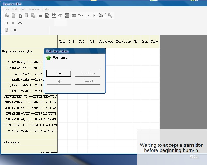 Here is an explanation for the "Waiting to accept a transition" message. Amos estimates the posterior distribution of the parameters by generating a sequence of parameter vectors. Each parameter vector depends on the one that came before, so the algorithm jumps from one parameter vector to the next. The size of the jump depends in part on the tuning parameter, although there is substantial randomness too. The "Waiting to accept a transition" message usually means that the initial jumps are so large that they produce parameter vectors of very low probability. Parameter vectors that have low probability are likely to be rejected. It could even be that the initial jumps are so large that they consistently produce parameter vectors for which the posterior probability is undefined. Setting the tuning parameter to a low value means that you won' t jump far, so you are unlikely to jump from a region of high probability to one of low probability in a single step. If you haven't changed the tuning parameter (on the Technical tab of the Bayesian Options window), it is probably still set at the default value of 0.7. To get past the warning, try successively smaller tuning values. The Options window is available in the View menu of the Bayesian SEM window. The Tuning parameter can be changed from either the Technical Tab (under Random Walk) or the MCMC tab.