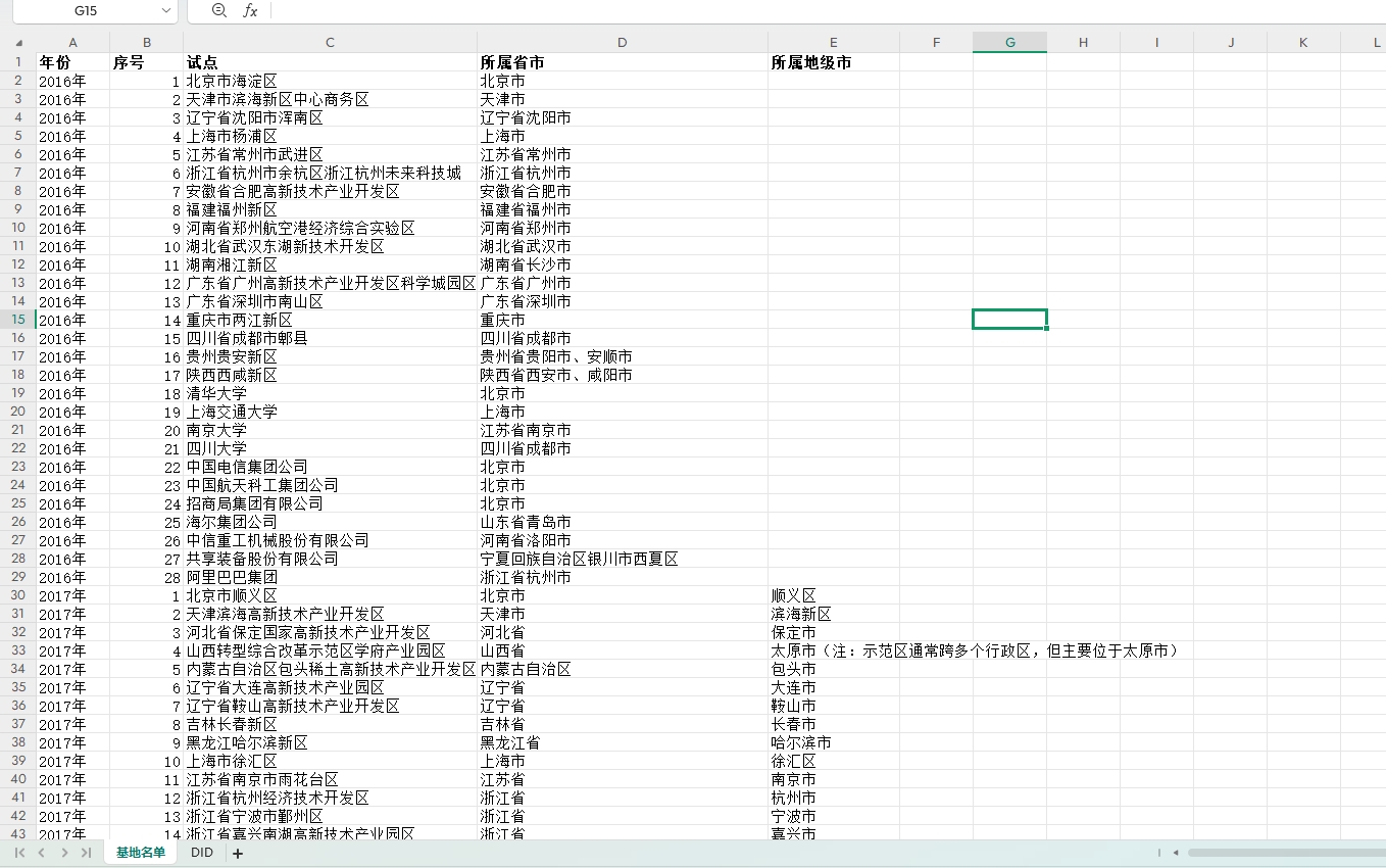 数据简介:国家级双创示范基地,也称为国家双创示范基地,是指国家级的双创示范基地(大众创业万众创新示范基地)。旨在更好发挥大众创业万众创新示范基地对促改革、稳就业、强动能的带动作用,进一步推动大众创业万众创新向纵深发展,更大程度激发市场活力和社会创造力,以新动能支撑保就业保市场主体,经国务院同意,决定在部分地区、企业、高校和科研院所建设第三批双创示范基地。参考范旭等(2024)的做法,使用各地区、单位被纳入国家级双创示范基地的政策虚拟变量(Treat×Post)表征。若样本地在名单当中,则赋值为 1,否则为0。需要注意的是,由于名单中存在企业、高校等单位,本文则认为这些单位所在地为样本地;Post为年份虚拟变量,在数据中为Time,需要注意的是,由于各个地区、单位被纳入名单的时间不同,因此在各地被批准为国家级双创示范基地的年份及之后取1,否则为0。