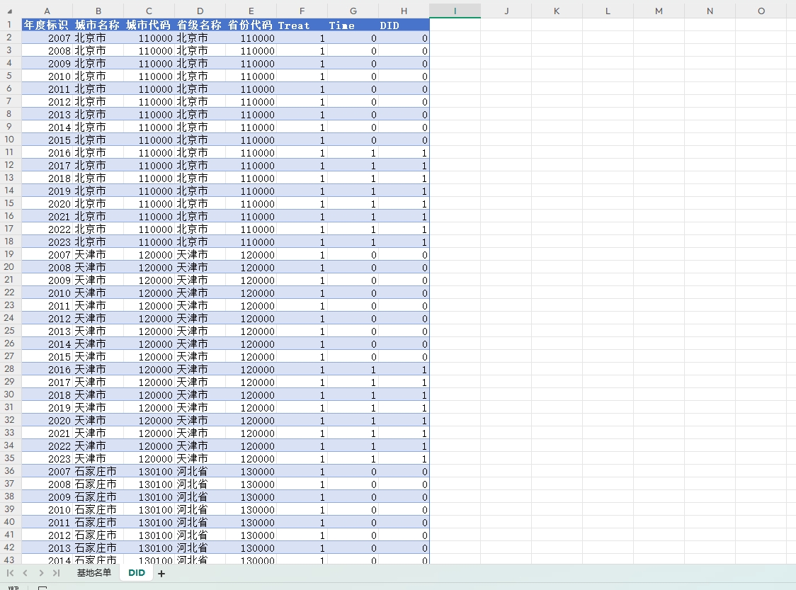 年度标识 | 城市名称 | 城市代码 | 省级名称 | 省级代码 | Treat | Time | DID |