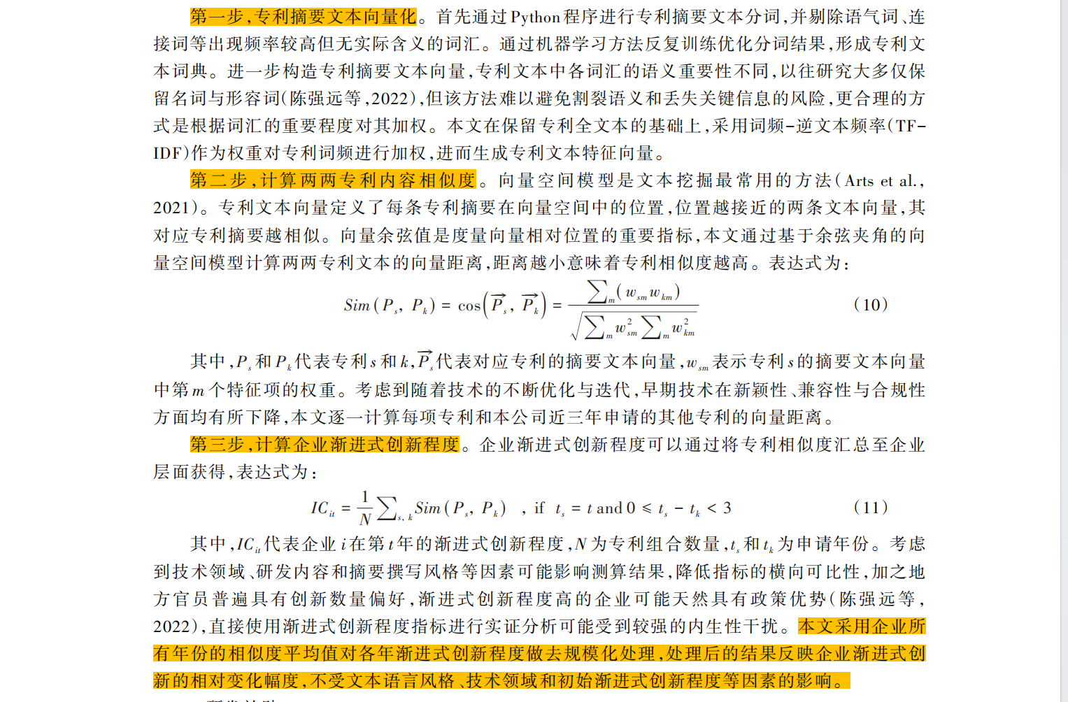 参考顶刊《经济研究》孙雅慧(2024)老师的做法,用当期创新和往期创新的内容重叠度作为衡量渐进式创新程度的合理指标。通过搜集海量专利摘要,测算当前专利申请和既有专利的内容相似度,反映企业在双元创新中更倾向于渐进式创新的程度,根据专利相似度构造企业层面渐进式创新程度指标,具体构造方式可以看下图