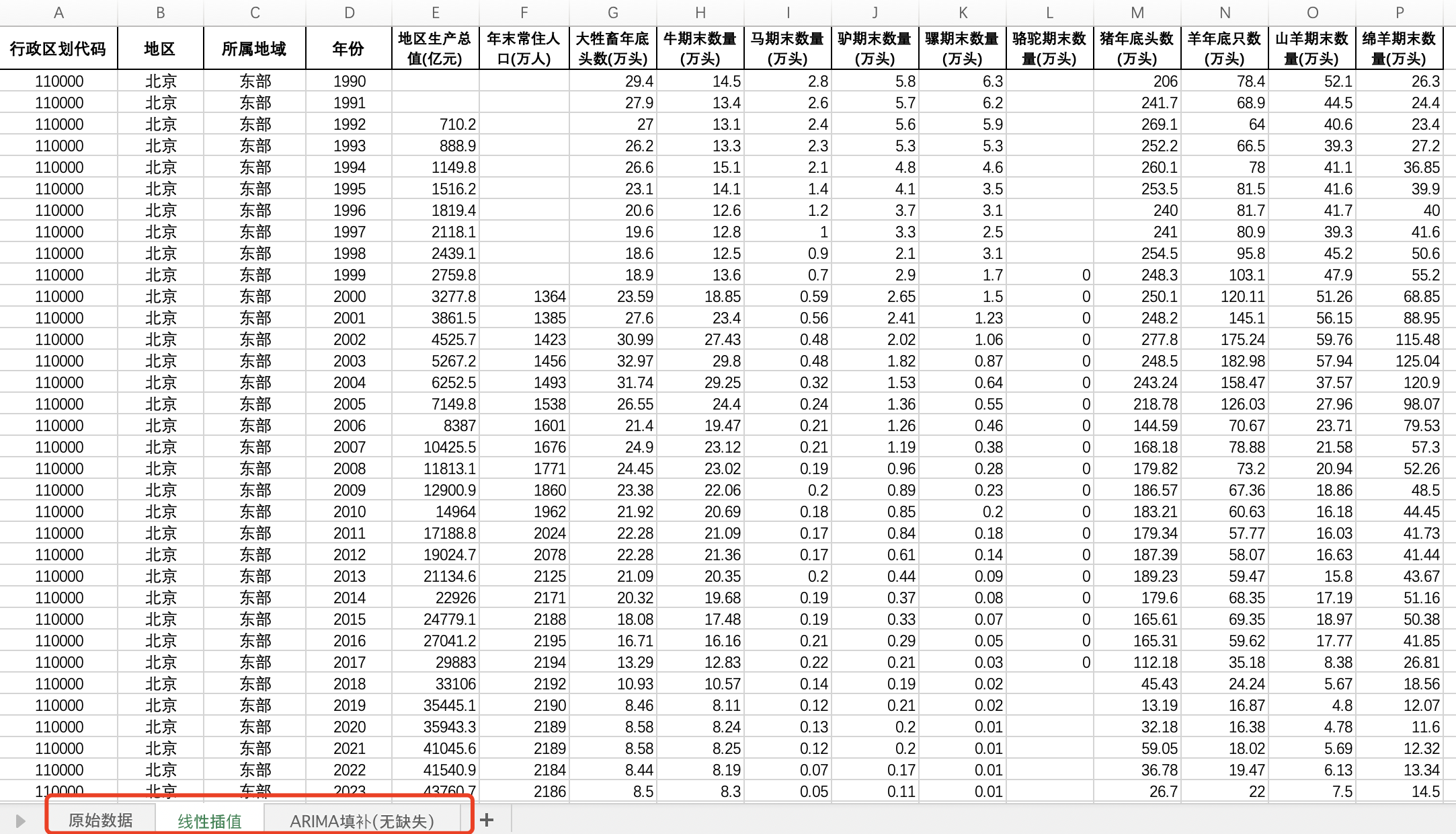 2023-1990全国31省份牲畜年底头数牛马驴骡骆驼期末数量猪羊年底头数山羊绵羊(插值填补无缺失版)
