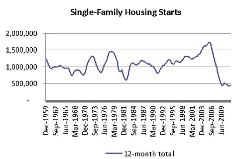 Whatever the underlying trend, there is no doubt that the industry remains very depressed. The following chart shows the running 12-month total of single-family housing starts from 1959 to 2009. The first thing you’ll notice is how high the number rose during the bubble. You have to look harder to see signs of the recent recovery.