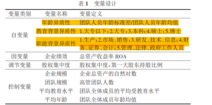 教育背景在一定程度上代表着人的知识和能力基础,并且影响人的认知。教育背景包括教育层次和教育类型。由于受到数据的限制,本次只研究高管团队受教育层次异质性对企业绩效的影响。我们认为受到较高水平教育的管理者在认知能力、学习能力、理解能力以及采取复杂的管理手段的倾向等方面普遍高于未受较高水平教育的管理者,因此团队教育背景异质性越大,对同一问题认识的偏差越大,越不容易形成共同的观点,影响决策