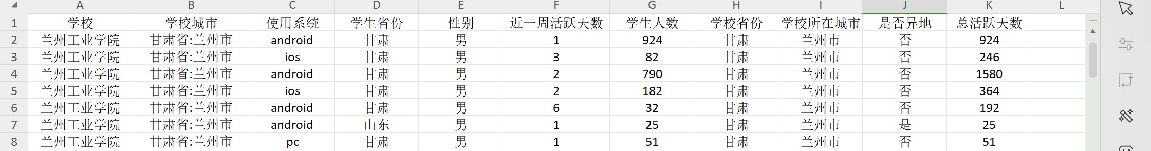 学生省份 性别 近一周活跃天数