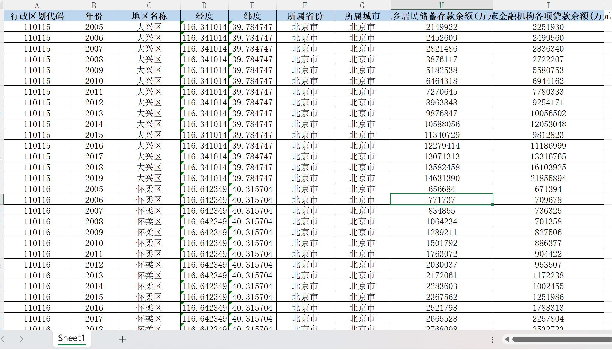 行政区划代码 年份 地区名称 经度 纬度 所属省份 所属城市 城乡居民储蓄存款余额(万元) 年末金融机构各项贷款余额(万元)