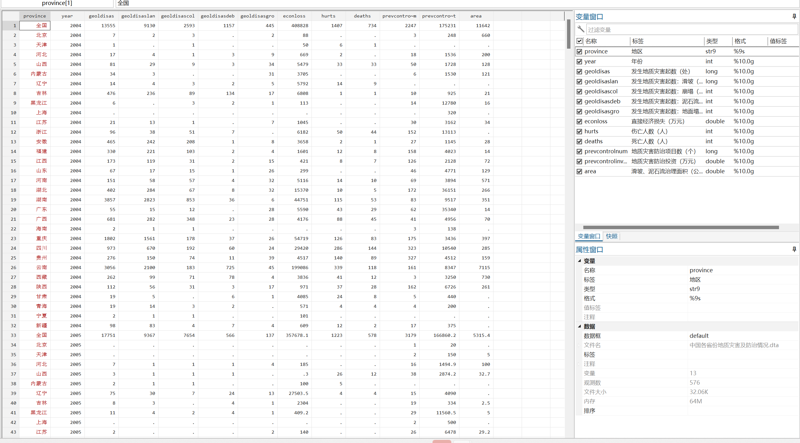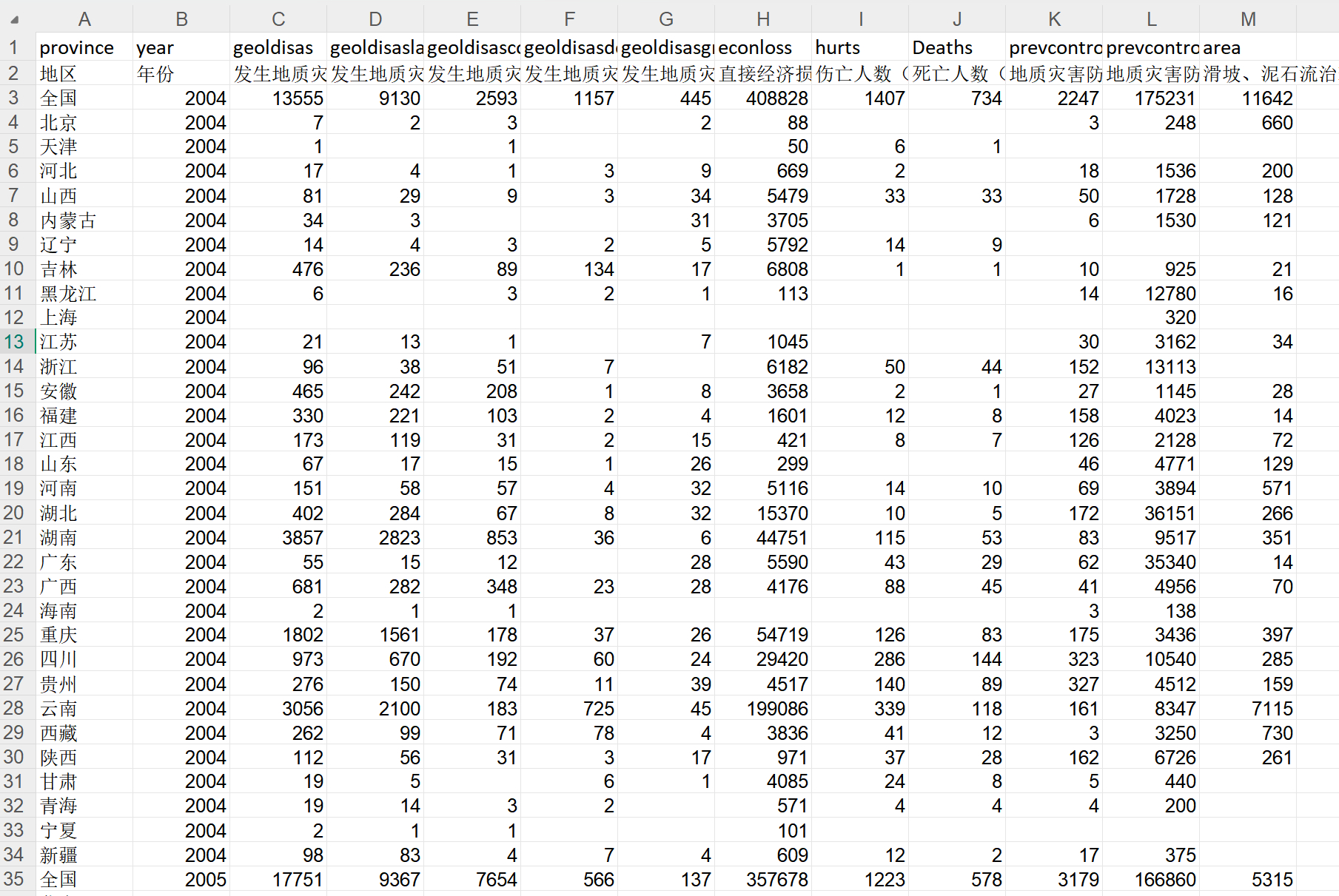 ▪ 数据说明: 中国各省份地质灾害及防治情况统计了中国31个一级行政区的地质灾害损失及防治情况,包含地区、年份、发生地质灾害起数(处)、直接经济损失(万元)、伤亡人数(人)、地质灾害防治项目数(个)、灾害防治投资(万元)、滑坡、泥石流治理面积(公顷)等变量。